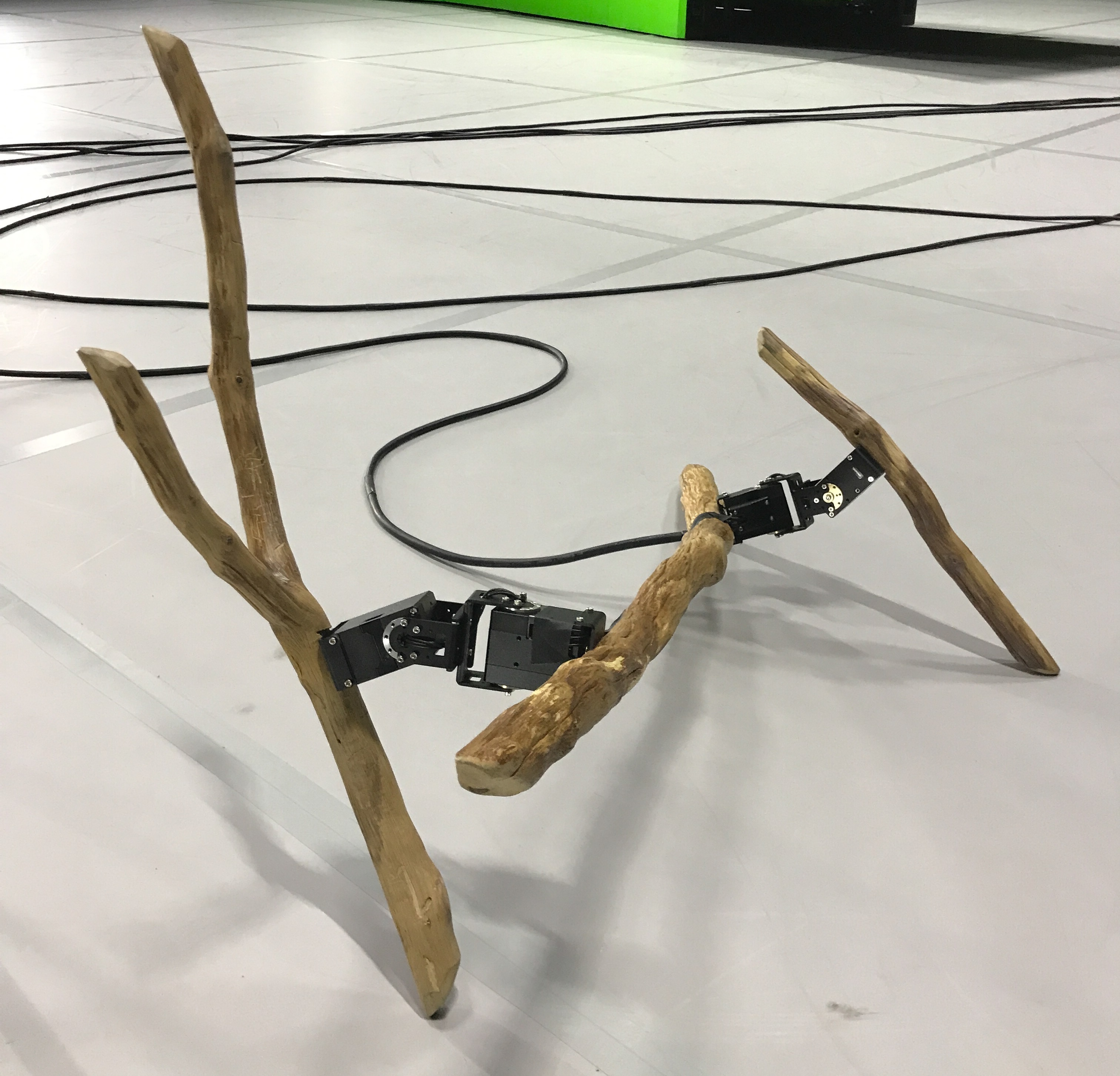 The Branchbots were custom-built from German oak branches harvested from fallen trees and high-torque Dynamixel robot servos. Having previously worked with dancers I realized that I would need to build a system where I could control the robots in real-time during rehearsals while the choreography was being developed. I used a remote controller during rehearsals and was able to respond to direction from the choreographer and record sequences of motion that could be looped and manipulated in real-time during the final performances. Finding a way to get the robots to move across the stage when they are made from branches was challenging! Because of the real-time control I was able to improvise with each robot to find a way to make them crawl and turn and then record the motion sequences.